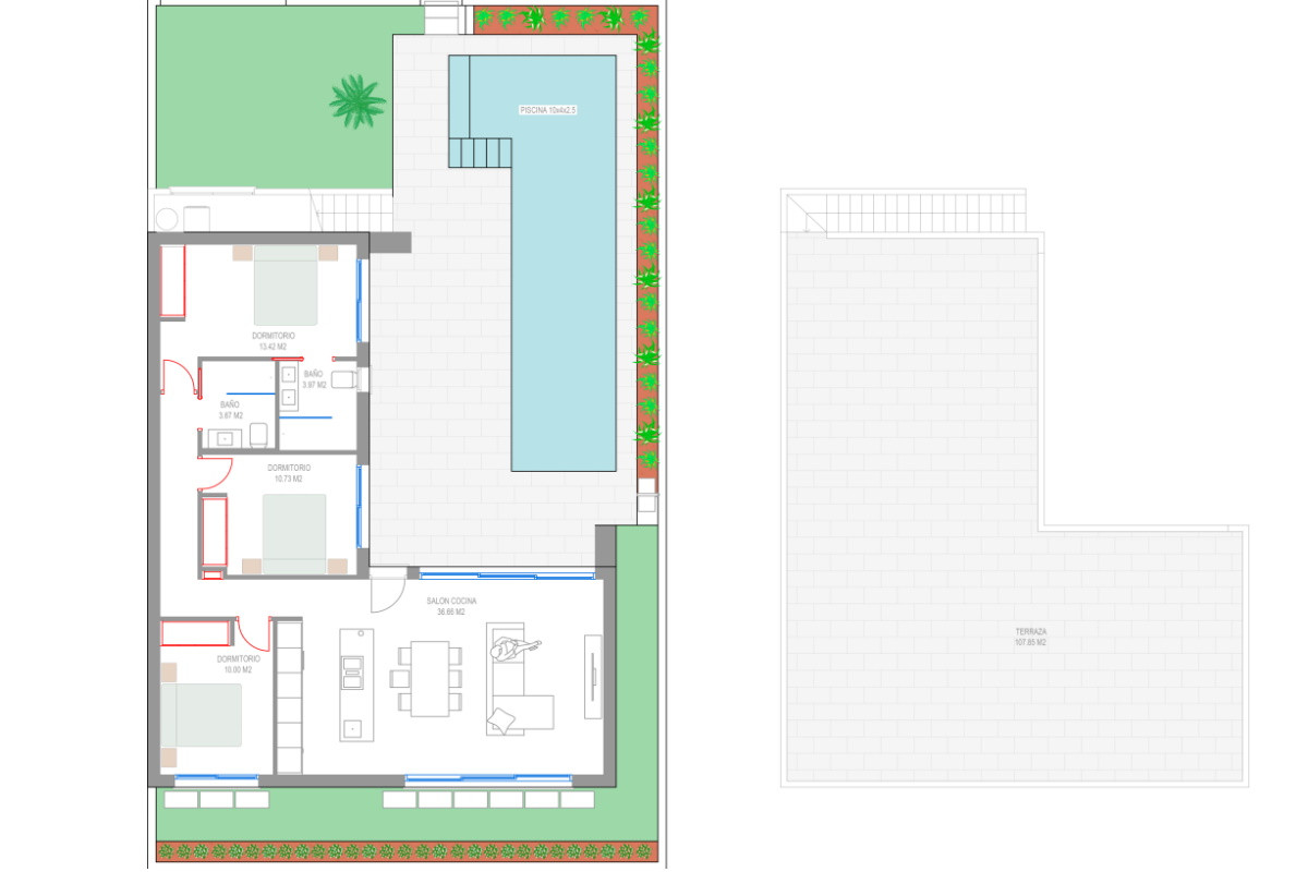 Alejandra XI offers you independent and semi-detached villas on one level. Each villa has 3 bedrooms and 2 or 3 bathrooms, and a distribution designed to make the most of natural light and ventilation. In addition, the open kitchen is perfectly integrated into the living room, creating a spacious and bright environment.
