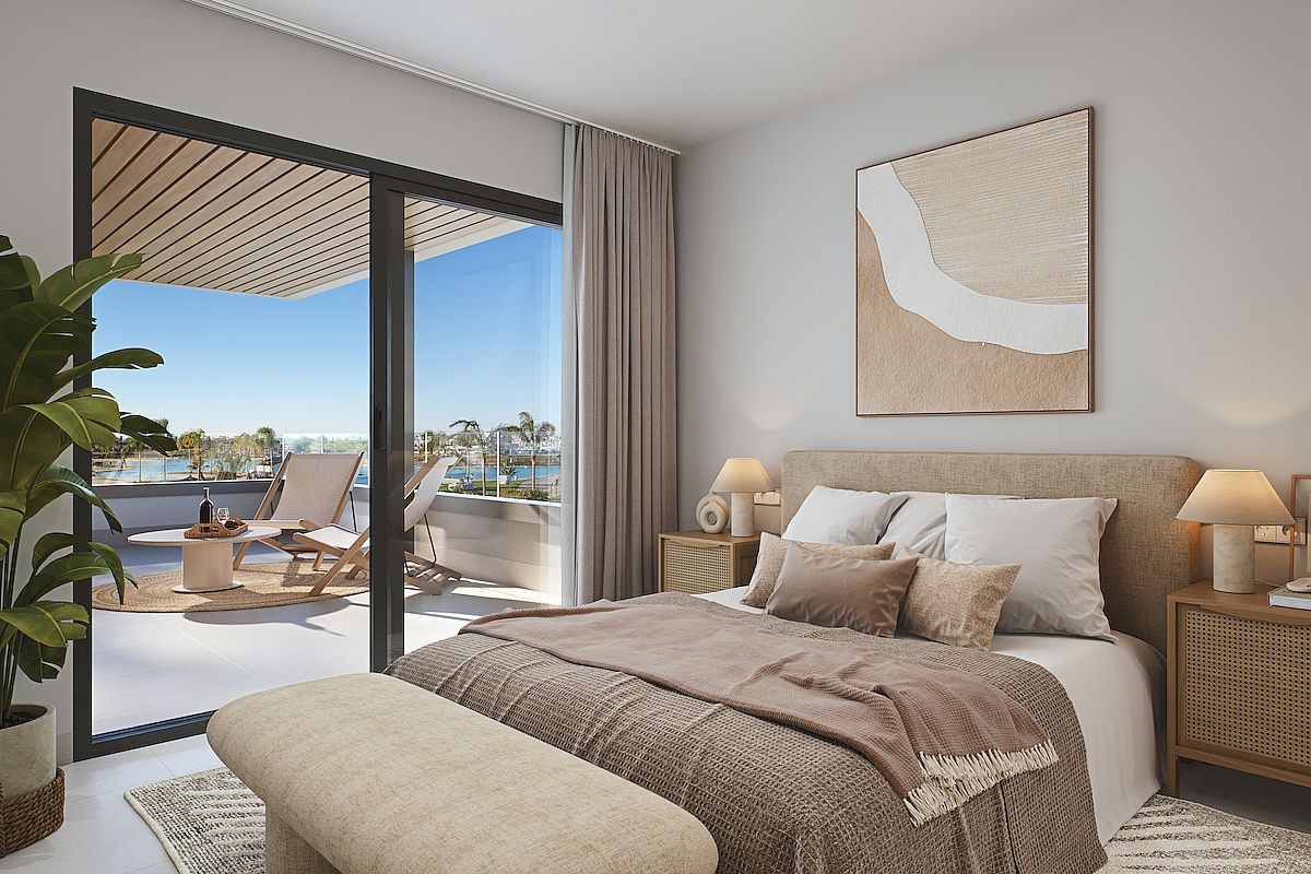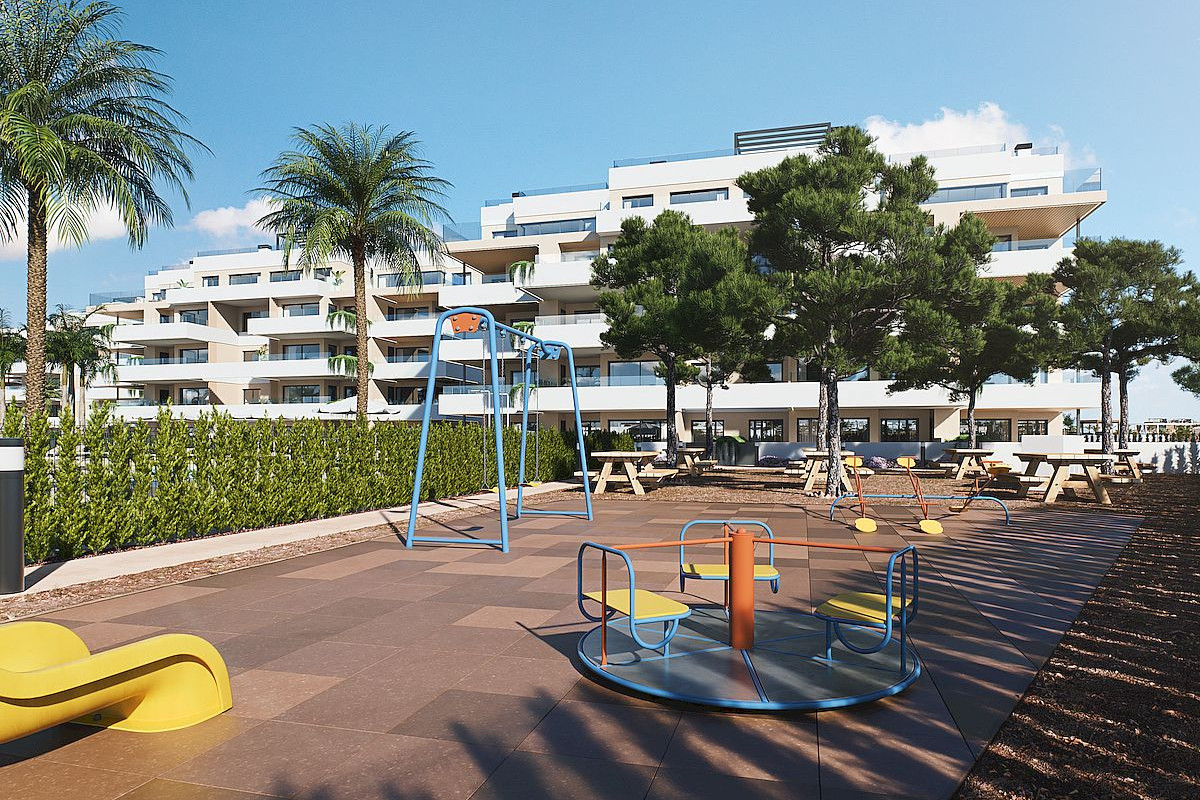 The project includes luxury apartments (two and three bedrooms), and magnificent penthouses, all with underground parking and storage room and the buildings are thoughtfully positioned with west-facing orientations. The upper floors enjoy beautiful views over the lake. Ground floor apartments with private garden, middle floors with large terraces and penthouses includes amazing solariums with swimming pool and outdoor kitchen. All properties with American kitchen integrated in the living room, with modern and functional design and large terraces overlooking the green areas.